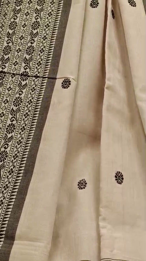 - Work: Intricate Kantha-style Butta motifs scattered across the body, with a detailed.Temple Border and heavily worked Anchal (Pallu).